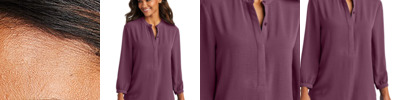 This beautifully draped tunic makes a statement with its longer length and accentuated gathers at the back yoke. 4.5-ounce, 100% polyester textured crepe Banded collar Covered placket Dyed-to-match faux shell buttons Deep Black buttons (Graphite) 3/4 sleeves with single-button cuffs Back yoke gathers Rounded drop tail hem