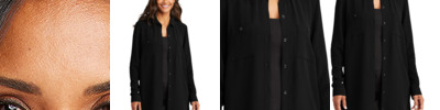 Comfortable and flattering, this long tunic has timeless style and endless versatility. 4.5-ounce, 100% polyester textured crepe Open collar Full-button front Faux black shell buttons Two button-through patch pockets Bust darts Roll sleeves with button tabs Back yoke with box pleat Longer length Elongated side slits