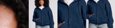 8.4-ounce, 80/20 ring spun cotton/polyester 75/25 ring spun cotton/polyester (Ring Spun Sport Grey) 100% ring spun cotton face 1x1 rib with spandex varsity collar, cuffs and bottom band Dyed-to-match reverse coil locking zipper Classic fit, tubular body Recycled, high-performing black tear-away label